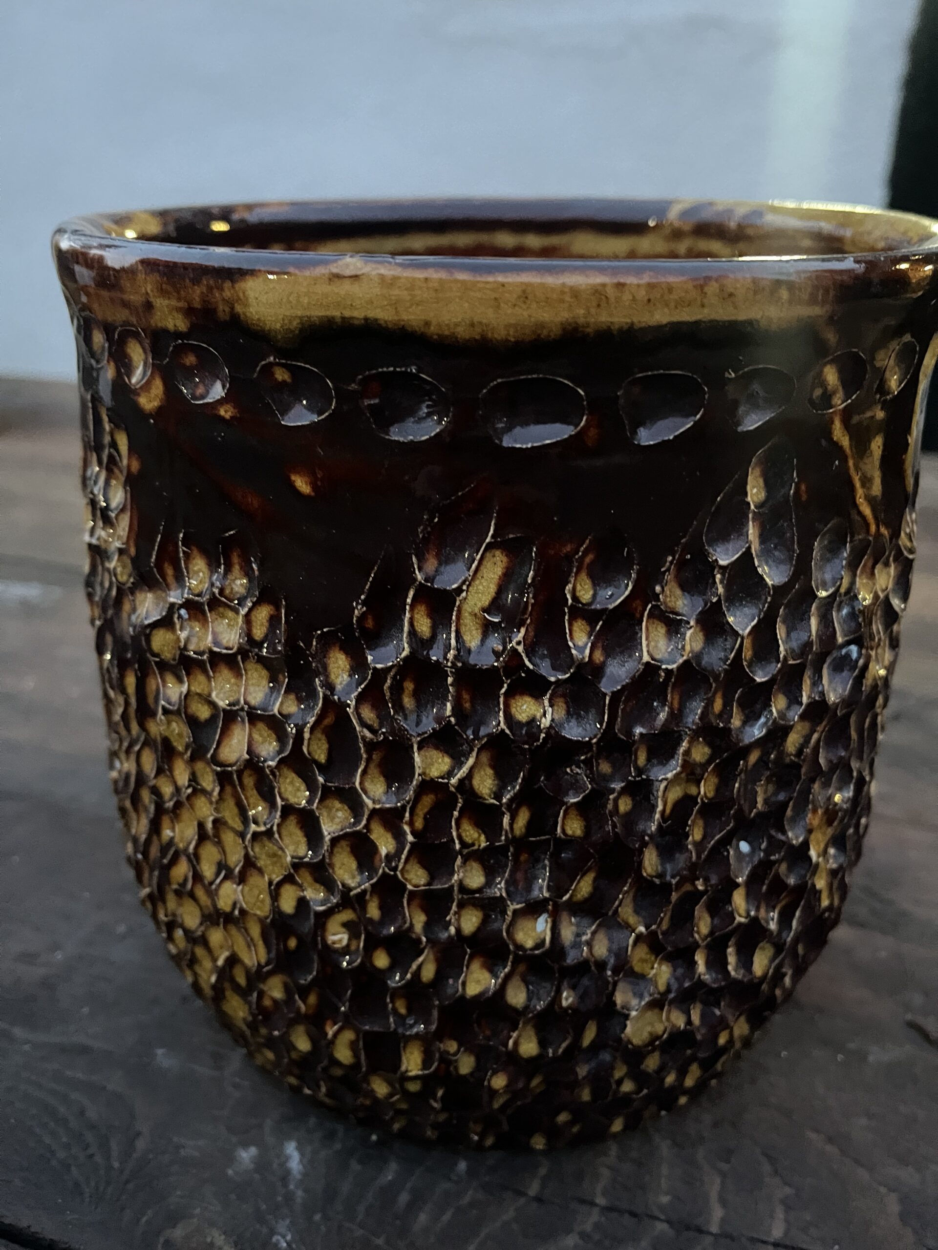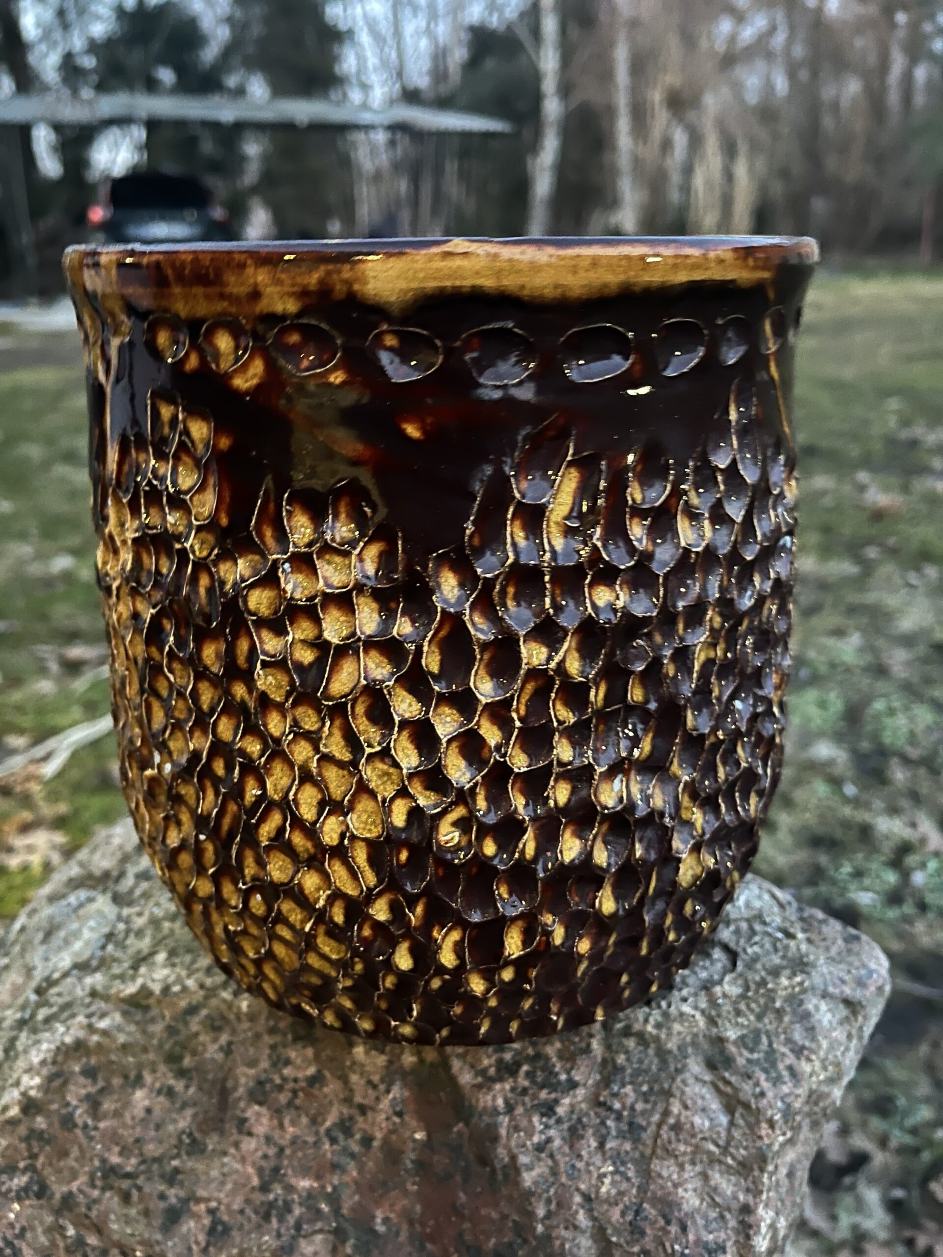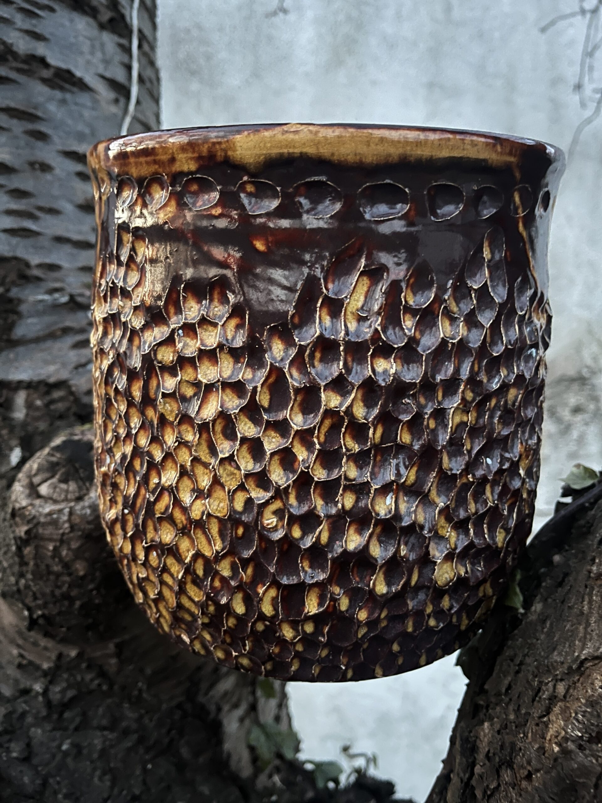 Wyrób toczony na kole garncarskim. Można go wykorzystać jako pojemnik lub osłonkę do kwiata. Średnica 18 cm, wysokość 19 cm.