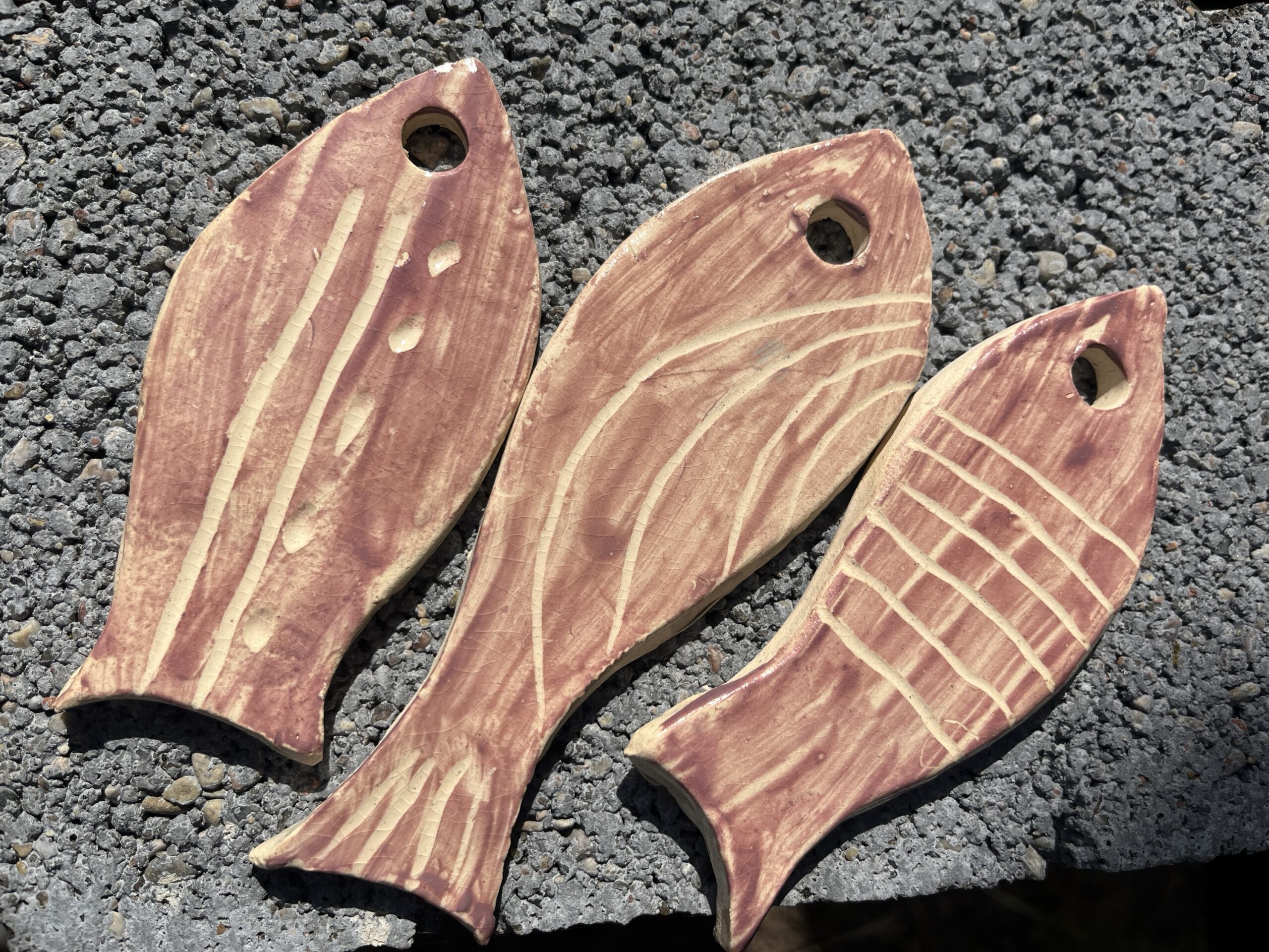 Ryby ceramiczne formowane ręcznie. Długość około 12 cm.